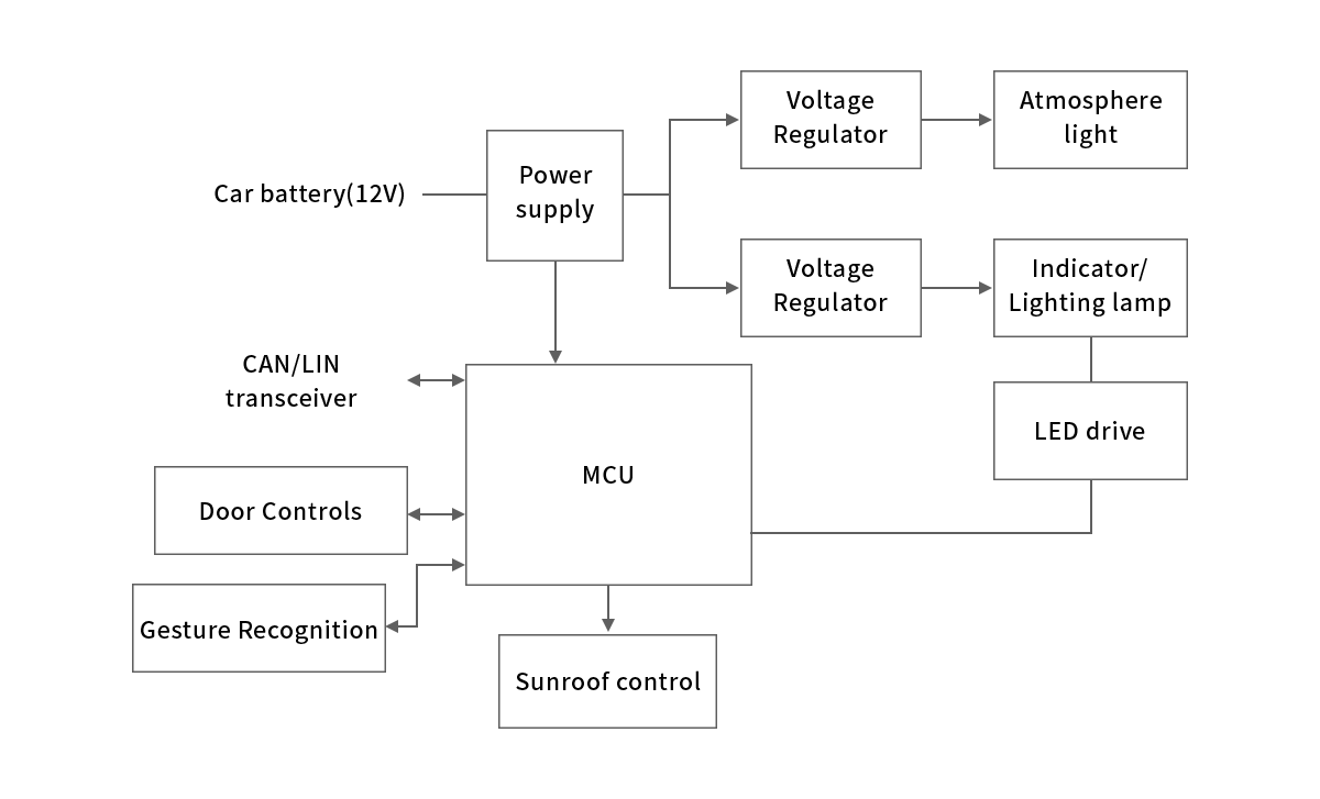 The interior lighting system typically employs two modes: user-controlled settings and automatic adjustment based on external light. Design engineers must guard against load dumping, surges, ESD, overcurrent, and other threats. PPTC resettable fuses are chosen for LED thermal protection, while TVS diode ESD suppressors provide ESD protection for user controls.