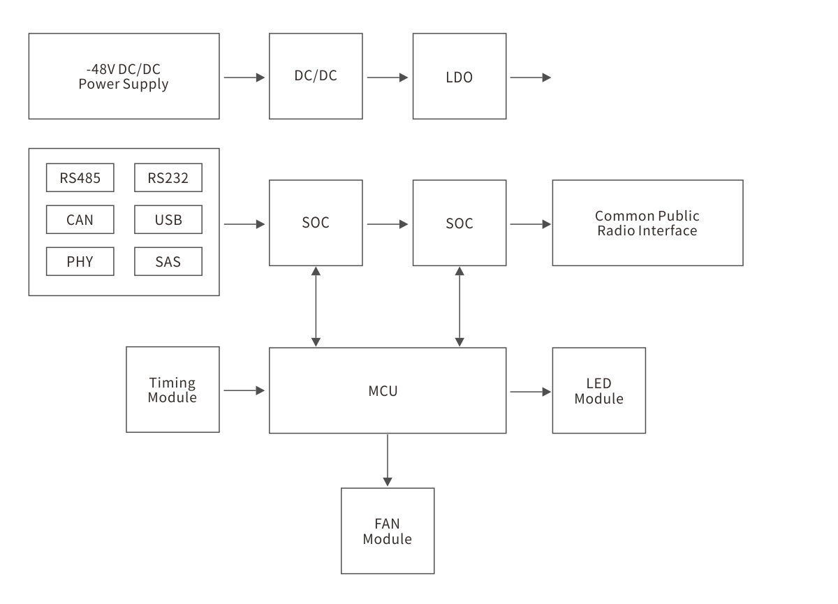 The BBU (Baseband Unit) is the base station's baseband processing unit, providing external interfaces and handling system resource management, operations and maintenance, and environmental monitoring functions. The BBU includes the main control unit FSMF module, baseband extension FBBA, and transmission extension FTIF.